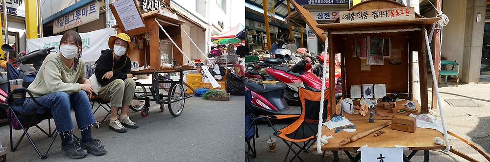 팀명이자 프로그램명인 ‘후(厚)’. 재래시장의 오고 가는 인심을 표방한 이름입니다. ‘예술을 등에 지고 완주로 향한다’며 예술 보부상의 포부를 말했던 그들이 계획을 제대로 실현했는데요. 10월 18일 삼례장, 20일 봉동장, 24일 고산장에서 자신들의 작품을 두고 물물교환을 진행했어요. 군고구마와 쥐포, 옷과 고기, 매실장아찌와 김부각 등 교환물품도 다양했습니다. 작품을 교환한 고객들은 이름을 한 자 한 자 둥글게 적어 사발통문을 만들었죠. 돈을 떠나 예술의 가치를 실험해보고 싶었던 세 사람의 재미있는 프로젝트였어요.