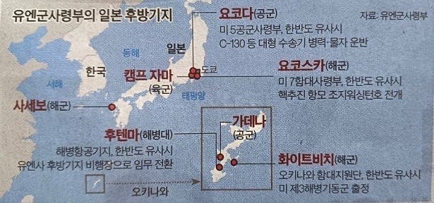 6·25전쟁 당시 유엔 참전국 전시 물자가 일본을 거쳐 한반도에 반입된 것은 잘 알려진 사실이다. 1950년 7월 유엔군 사령부가 처음 설치된 곳도 서울이 아닌 도쿄였다. 공산 세력의 남하를 저지해야 하는 유엔군에 일본의 병참 기지 역할은 사활이 걸린 문제였다.1951년 9월 샌프란시스코 강화조약 체결로 일본이 미군정에서 벗어나 주권을 회복하자 일본과 유엔군의 관계 설정 문제가 대두한다. 미국은 일본과 안보 조약을 체결하면서 유엔군의 일본 영토 주둔과 일본의 병참 지원(logistics support) 제공을 요청하였고, 일본은 이를 수락하였다. 이러한 내용을 담은 외교 문서를 ‘요시다-애치슨 교환 공문’이라고 한다. 이에 따라 체결된 ‘유엔군 지위 협정’은 유엔군 전력이 한반도에 투입되고 일본이 지원 의무를 부담하는 법적 근거로 지금까지 효력을 유지하고 있다.유엔사는 1957년 서울로 이전하였으나, 요코타(橫田) 공군기지에는 지금도 유엔군 후방 사령부가 존속하고 있으며, 주일 미군 핵심 기지 7곳이 유엔군 시설로 쓸 수 있도록 지정되어 있다. 유엔사는 단지 상징적 존재가 아니라 한반도 유사시 유엔군 전력의 즉시 투입과 일본의 병참 지원을 통해 억지력을 담보하는 실효적 안전보장 장치라고 할 수 있다. 유엔사를 매개로 작동하는 한·미·일 삼각 협력이 한반도 안보의 근간이라고 바꿔 말해도 좋다.자국 영토를 외국의 무력 분쟁에 후방 기지로 사용하도록 양해하는 것은 결코 당연한 것이 아니다. 일본 내에도 한반도 전쟁에 일본이 자동적으로 개입하는 결과가 초래된다며 반대하는 목소리가 있다. 한일 관계 악화를 부추기거나 정전 체제를 종전 체제로 바꾸자는 주장은 그 속내가 유엔사 해체를 통한 삼각 협력 균열에 맞춰져 있는 경우가 많다. 이는 북한과 그 추종 세력이 가장 바라는 바이기도 하다. 캠프 데이비드를 장소로 택하며 상징성을 더한 이번 한·미·일 정상회의가 삼각 협력을 더욱 공고히 하는 계기가 되기를 바란다.(신상목, 기리야마본진 대표, 전 주일대사관 1등 서기관)