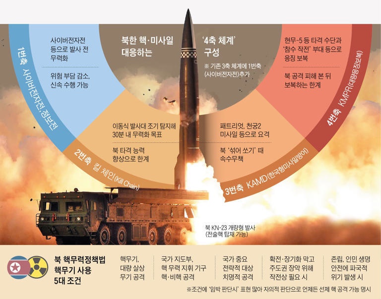 지난 2016~2017년 북한은 무수단 중거리 탄도미사일을 집중적으로 시험발사했지만 8차례 중 무려 7차례나 실패했다. 웬만하면 성공해온 북한 미사일 개발사에서 유례를 찾기 힘든 매우 이례적인 사건이었다.당시 무수단 미사일은 발사 직후 또는 직전 폭발하는 등 다양한 실패를 경험했다. 유례 없는 실패 행진에 의문이 증폭됐는데 그 의문이 2017년 뉴욕타임스 보도를 통해 어느 정도 풀렸다.2017년 3월 미 뉴욕타임스는 미국이 ‘발사의 왼편(Left of Launch)’이라 불리는 사이버 교란 작전을 통해 북 미사일의 잇따른 실패를 초래했다고 보도했다. 모든 미사일은 발사 때 ‘준비→발사→상승→하강’의 단계를 거친다.발사 단계보다 왼쪽에 있는 준비 단계에서 사이버 공격으로 시스템을 교란한다는 의미에서 이런 명칭이 붙었다. ‘발사의 왼편’ 프로그램은 2013년 2월 북한의 핵실험 위력에 놀란 미 국방부가 개발을 시작했고, 오바마 행정부가 이듬해 북 미사일을 무력화하는 새로운 방식으로 이 작전 개념을 택했다.‘발사의 왼편’ 작전 이후 3년간 북한 미사일(무수단) 실패율은 88%에 달한 것으로 분석됐다.‘발사의 왼편’ 전략은 지난해 다시 주목을 받았다. 바이든 행정부 출범 이후 전·현직 미 정부 및 군 고위 관계자들이 잇따라 그 효용성과 중요성을 언급하고 나선 것이다.지난해 2월 존 하이튼 미 합동참모본부 차장은 “요격에 초점을 맞춘 기존 방어전략은 (사드·패트리엇 등) 요격체계의 수량을 고려할 때 한계가 분명하다”며 “미사일이 발사되기 전에 차단하는 ‘발사의 왼편’에 초점을 둔 종합적인 방어전략을 추진해야 한다”고 말했다.하지만 매우 제한적이고 폐쇄적인 북한 인터넷망 특성상 사이버전 위주의 ‘발사의 왼편’ 전략은 한계가 있다는 지적도 설득력 있게 제기된다. 그래서 나온 것이 사이버전+전자전(電子戰), 즉 사이버전자전 전략이다.군 정보부대장을 지낸 송운수 예비역 육군소장은 올해 초 박사 학위 논문을 통해 사이버전과 전자전을 통합한 사이버전자전이 필요하다고 강조했다.북 핵탄두 미사일 발사 통제 등 지휘통제망에 대한 접속은 전자전으로 해 전자파에 사이버 악성코드나 해킹 프로그램을 실어 보내고, 접속 후 효과(무력화)는 사이버전으로 달성해 시너지 효과를 거둔다는 것이다. 물리적으로 때려 부수는 ‘하드 킬’(hard-kill)이 아니라 파괴하지 않고 무력화하는 ‘소프트 킬’(soft-kill) 무기인 셈이다.최근 국방부가 주최한 ‘국방혁신 4.0′ 세미나에서도 사이버전자전 등 소프트 킬을 강조한 주제발표가 있었다. 김선호 예비역 중장(전 수방사령관)은 이 세미나에서 기존 3축 체계에 사이버전자전, 심리전 등 정보작전을 수행하는 비물리적 수단을 결합한 ‘신(新) 3축체계’를 제안했다.3축 체계는 선제타격을 포함하는 킬 체인(Kill Chain)과, 발사된 북 미사일을 요격하는 KAMD(한국형미사일방어), 북한에 강력한 응징보복을 하는 KMPR(대량응징보복) 등으로 구성돼 있다.김 전 사령관은 “기존 3축 체계는 물리적 수단을 활용한 선제타격 시 감수해야 할 위험이 크기 때문에 결심 과정이 지연될 개연성이 있다”며 “하지만 사이버전자전 등은 감수해야 할 위험이 상대적으로 감소해 신속하고 공세적인 결심을 할 수 있다”고 밝혔다.최근 북한의 도발은 유례 없이 공세적인 모습들을 보이고 있다. 미 항모 전단이 동해상에 출동해 한미 연합훈련을 하고 있는 중에, 국군의 날 당일에 미사일을 쏜 것은 처음이다. 9일엔 새벽 1시48분에 미사일을 쏘는 등 밤낮, 휴일을 가리지 않고 우리 취약시간대에 미사일 도발을 계속하고 있다.한반도 긴장 수위가 최고조에 달했던 2017년으로 되돌아간 모습이다.앞으로 시기의 문제일 뿐 SLBM(잠수함발사탄도미사일), ICBM(대륙간탄도미사일) 발사는 물론 7차 핵실험을 할 가능성도 확실시되고 있다. 정부와 군 당국은 한미동맹을 활용한 확장억제와 한국군 3축 체계 강화를 그 대책으로 되뇌고 있다.하지만 일각에선 “전술핵 등 북한의 핵·미사일 위협은 지난 수년간 크게 고도화했는데 확장억제와 3축 체계만으로 증대된 위협에 제대로 대처할 수 있을까”라며 의구심이 늘고 있는 것 또한 부인할 수 없는 현실이다.북한은 더구나 지난달 핵무기 사용 5대 조건을 명시하며 선제 핵타격을 법제화한 ‘핵무력정책법’까지 발표했다. 그 때문에 기존 한미 대응책을 넘어서는 새로운 차원의 대책이 절실해지고 있다.그런 측면에서 몇몇 전문가들이 주장한 사이버전자전 등 ‘소프트 킬’ 개념을 기존 3축 체계 내(內)가 아니라 별도의 축(軸)으로 추가, 4축 체계 구축을 추진할 것을 제안한다. 4축 체계는 사이버전자전에 그만큼 비중을 둔다는 의미다. 윤석열 정부가 강조하고 있는 4차 산업혁명, 국방혁신 4.0의 의미도 포함하고 있다.4축 체계에선 세계 최대 중량 탄두를 장착한 현무-5 ‘괴물미사일’, 북 수뇌부 제거 특수부대(참수작전 부대) 등을 포함하는 KMPR이 4번째 축이 되는데 이는 북 핵도발 시 김정은 정권에게 ‘죽을 사(死)’, 즉 죽음을 선사한다는 중의(重義)적 의미도 있다.4축 체계는 사이버와 AI(인공지능) 등 4차 산업혁명 기술을 적